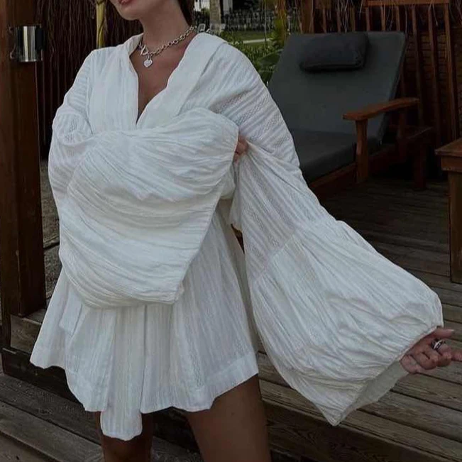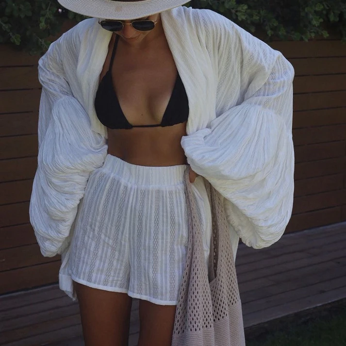 2025 New Summer Casual Loose Bubble Sleeves V Neck Two Piece Suit Holiday Beach Lady Wear Women Solid Jacquard Shirt Shorts Set